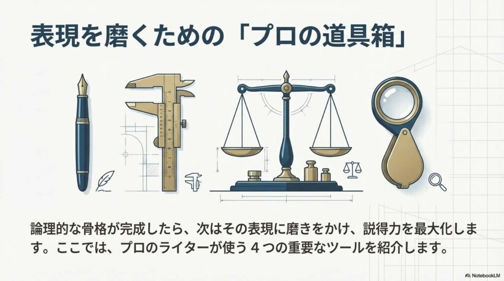 今回ご紹介した4つのテクニックは、単なる文章術ではありません。それは、読者の思考を尊重し、誠実で知的な対話を紙の上で築くための「思考のフレームワーク」です。