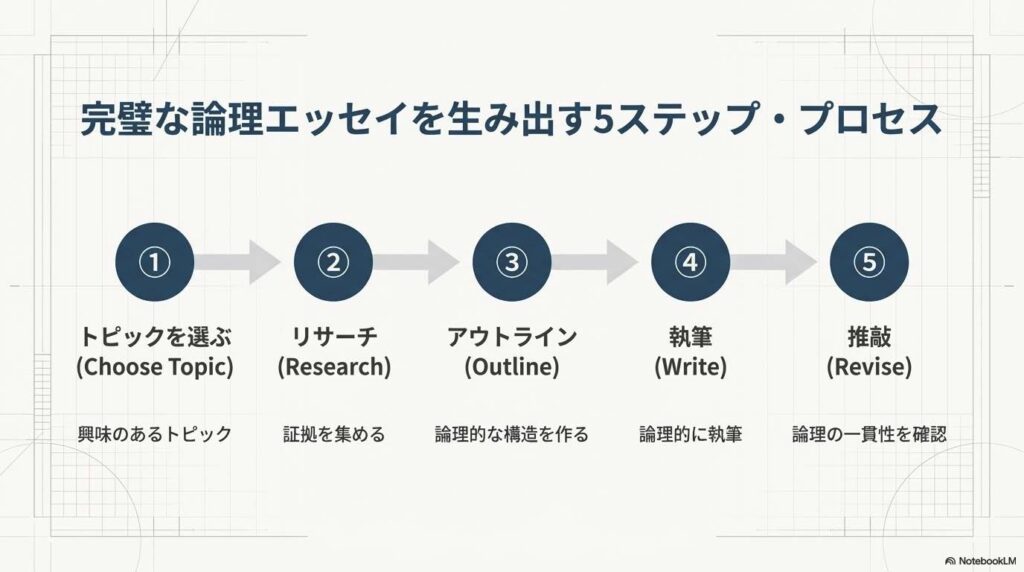 | PEEL構造 (PEEL Structure) | パラグラフを論理的に構成するためのフレームワーク。Point(主張)、Evidence(証拠)、Explanation(説明)、Link(次の段落への接続)の頭文字から成る。 |