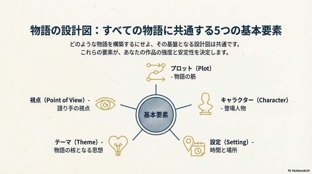 すべての物語は、いくつかの不可欠な要素から成り立っています。初心者がまず集中すべきは、物語の土台となる以下の「3つの柱」です。