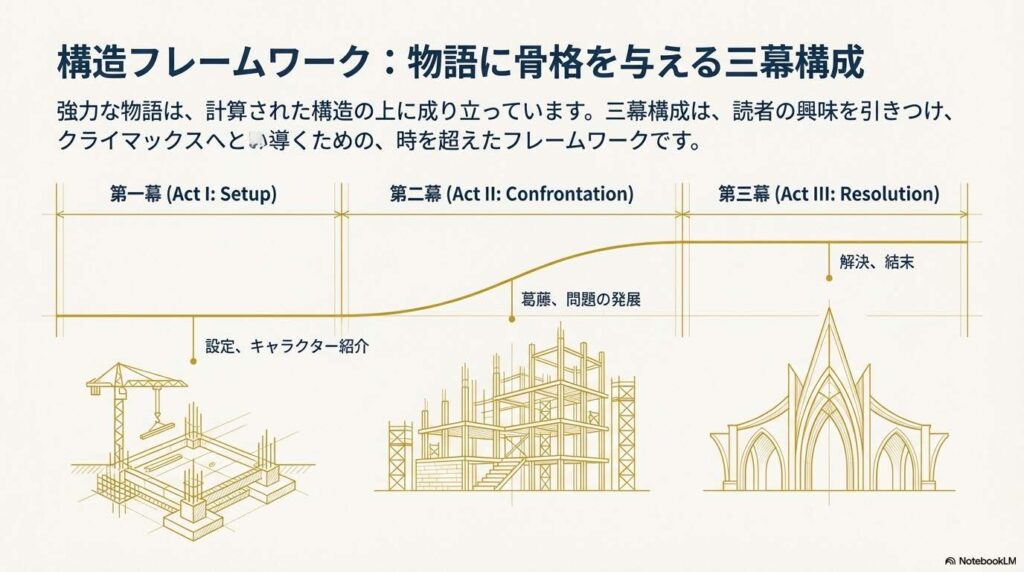 2. 三幕構成は物語の基本的な骨格です。第一幕(Setup)で設定やキャラクターを紹介し、第二幕(Confrontation)で葛藤や問題を発展させ、第三幕(Resolution)で物語を解決に導き、結末を迎えます。