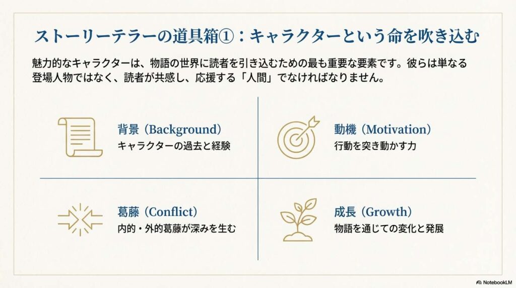 これら4つの要素が絡み合うことで、キャラクターは単なる名前から、読者が共感し、その運命を気にかけずにはいられない生きた人間へと変わるのです。