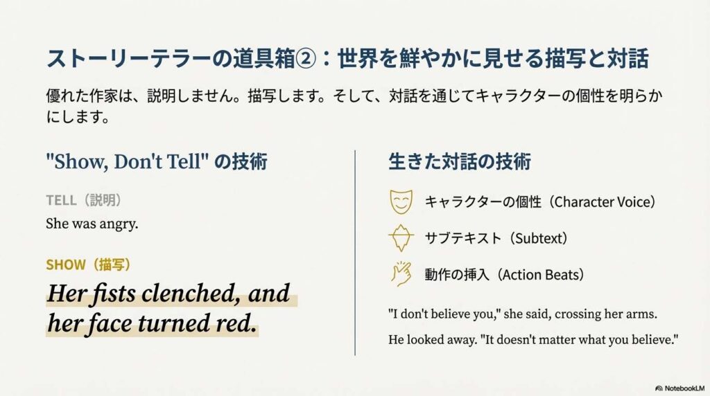 1. 「説明」ではなく「描写」する:Show, Don’t Tellの魔法