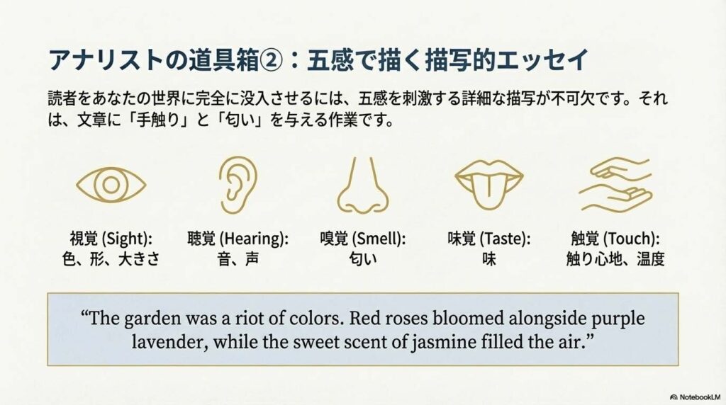 9. 描写的エッセイでは、読者の心に鮮明なイメージを喚起するために「五感」(視覚、聴覚、嗅覚、味覚、触覚)を積極的に活用します。色、音、匂い、味、手触りなどを具体的に描写することが求められます。