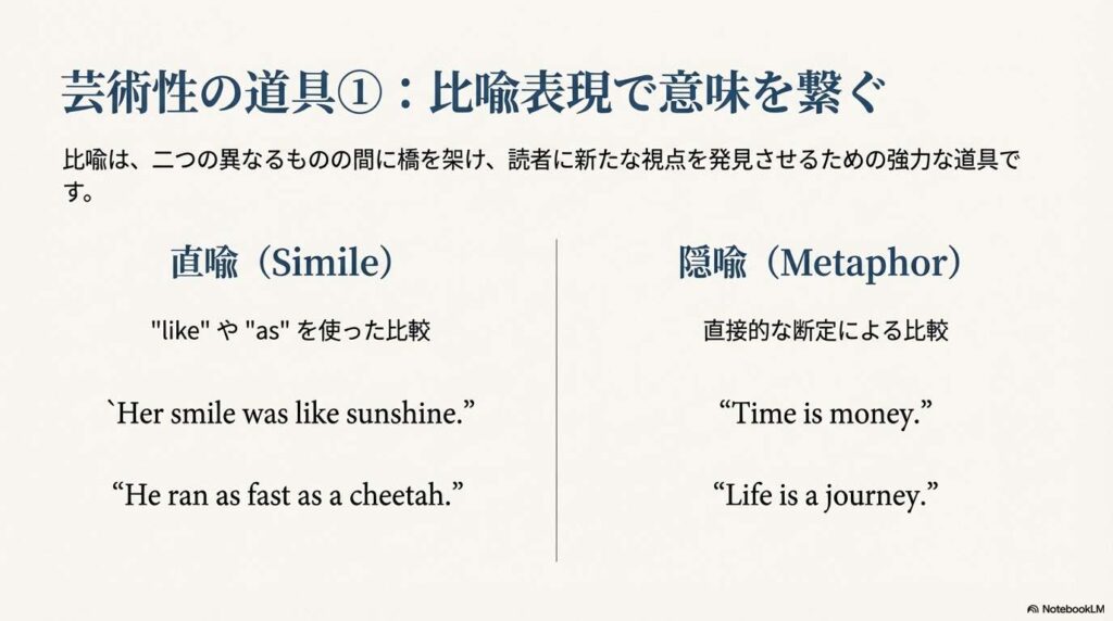 | 直喩 (Simile) | 「like」や「as」のような言葉を用いて、二つの異なるものを比較する比喩表現。 |