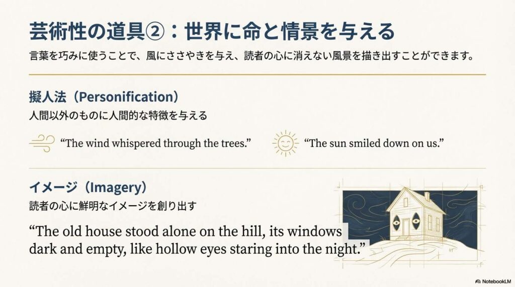 キャラクターの行動や会話を学んだところで、さらに文章全体を豊かにする表現技法へと進みましょう。
