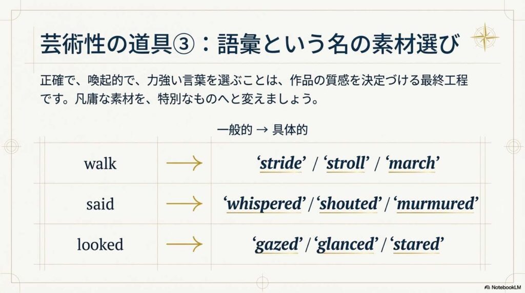 文章をより具体的にするためには、語彙の選択が非常に重要です。ありふれた単語を、より具体的で生き生きとした単語に置き換えるだけで、読者の心に描かれるイメージは格段に鮮明になります。