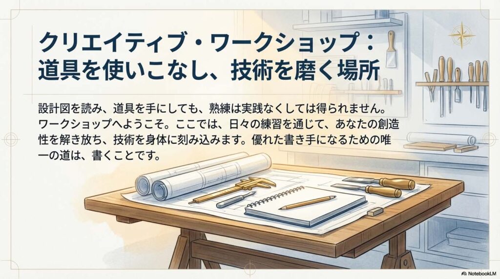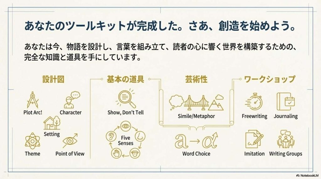 今回ご紹介した4つのコツ、「説明より描写」「動詞で魅せる」「動作で語る対話」「模倣から学ぶ」は、どれもすぐに実践できるパワフルなテクニックです。クリエイティブライティングは、魔法のような才能ではなく、具体的な技術の積み重ねによって上達します。