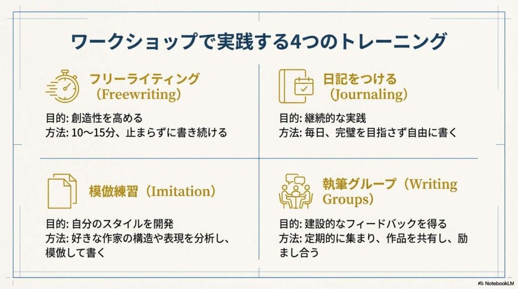 | 模倣練習 | 尊敬する作家の文体や構成を分析し、それを真似て書くことで技術を学ぶ練習方法。 |